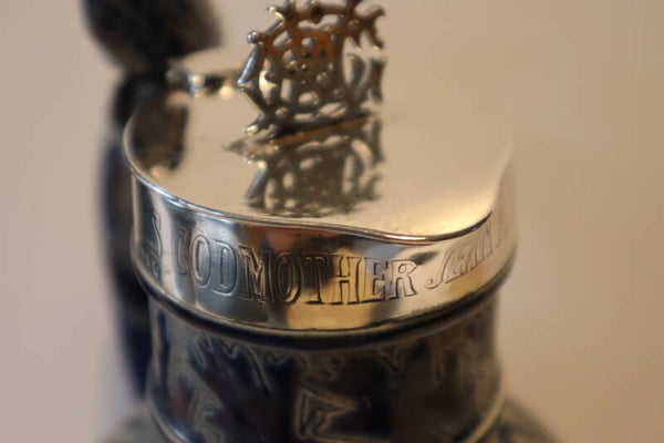opschrift op de rand van het deksel GIVEN BY HIS GODMOTHER JEAN A. F .ALSTON 10 APRIL 1875