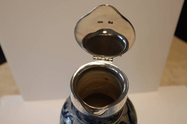 bovenan is er een zilveren deksel geplaatst van Percy Holland & Gibson , gemerkt zijkant deksel PH GG EN 4 merktekens met leeuw /masker /t /hoofd