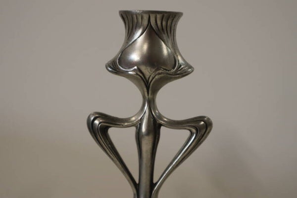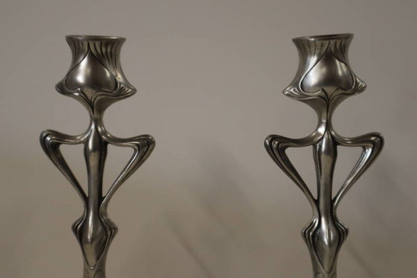 Koppel art nouveau kandelaars ,gemerkt onderaan stempels van tin en gesigneerd Achille GambaAchille Gamba was een Itaiaanse artiest 1881-1944 .Deze artiest zit momenteel in de lift .zijn voorwerpen zijn gegeerd bij verzamelaars. Hoogte 23,8cm
